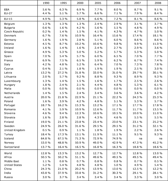 The table shows the share of renewable energy in total gross energy inland consumption (in %)