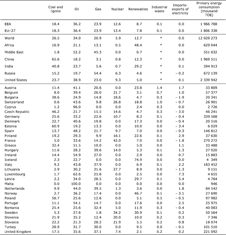 Negative values mean there were more exports than imports of electricity. No data was available for industrial waste for the non-european countries. The value for renewables for the non-european countries is inclusive industrial waste. No data was available of 2007 for Iceland from Eurostat, the data of 2006 was used.