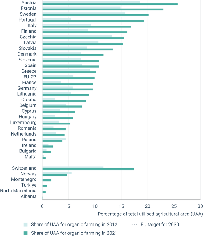 Data source: ‘Organic crop area by agricultural production methods and crops’, data from 2012 onwards (Geopolitical entity: EU27_2020,Unit of measure: percentage of total utilised agricultural area) (Eurostat, 2023).