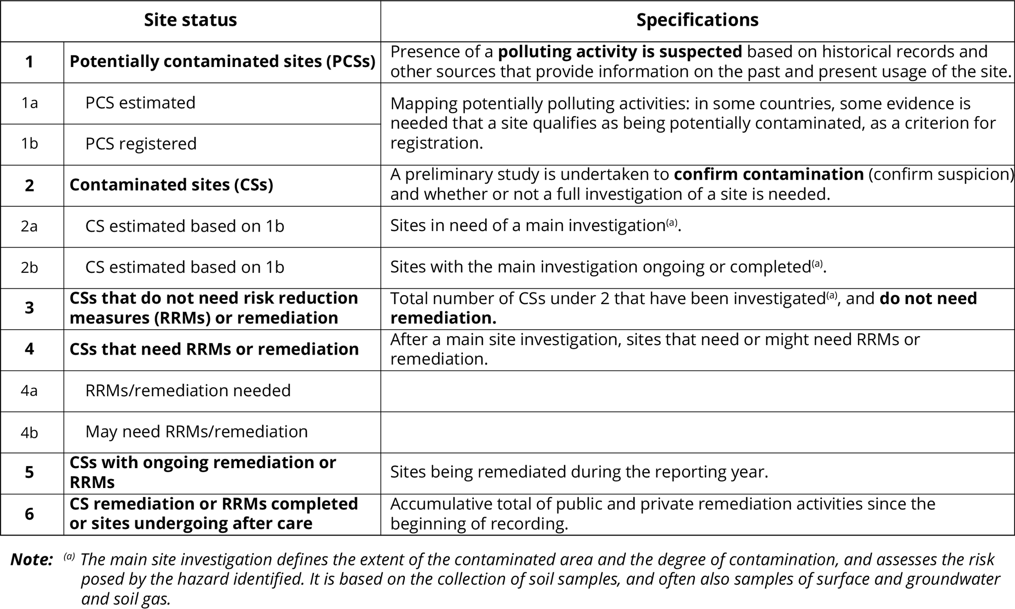 This table presents the definition of six management steps (site status) which characterise the management status of contaminated sites.