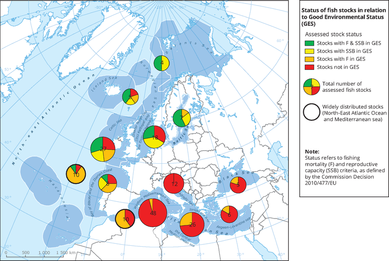 For the regions covered by ICES this is based on the status in 2012, in the regions covered by GFCM and ICCAT the latest assessment was used which in practice involves assessments as far back as 2007.