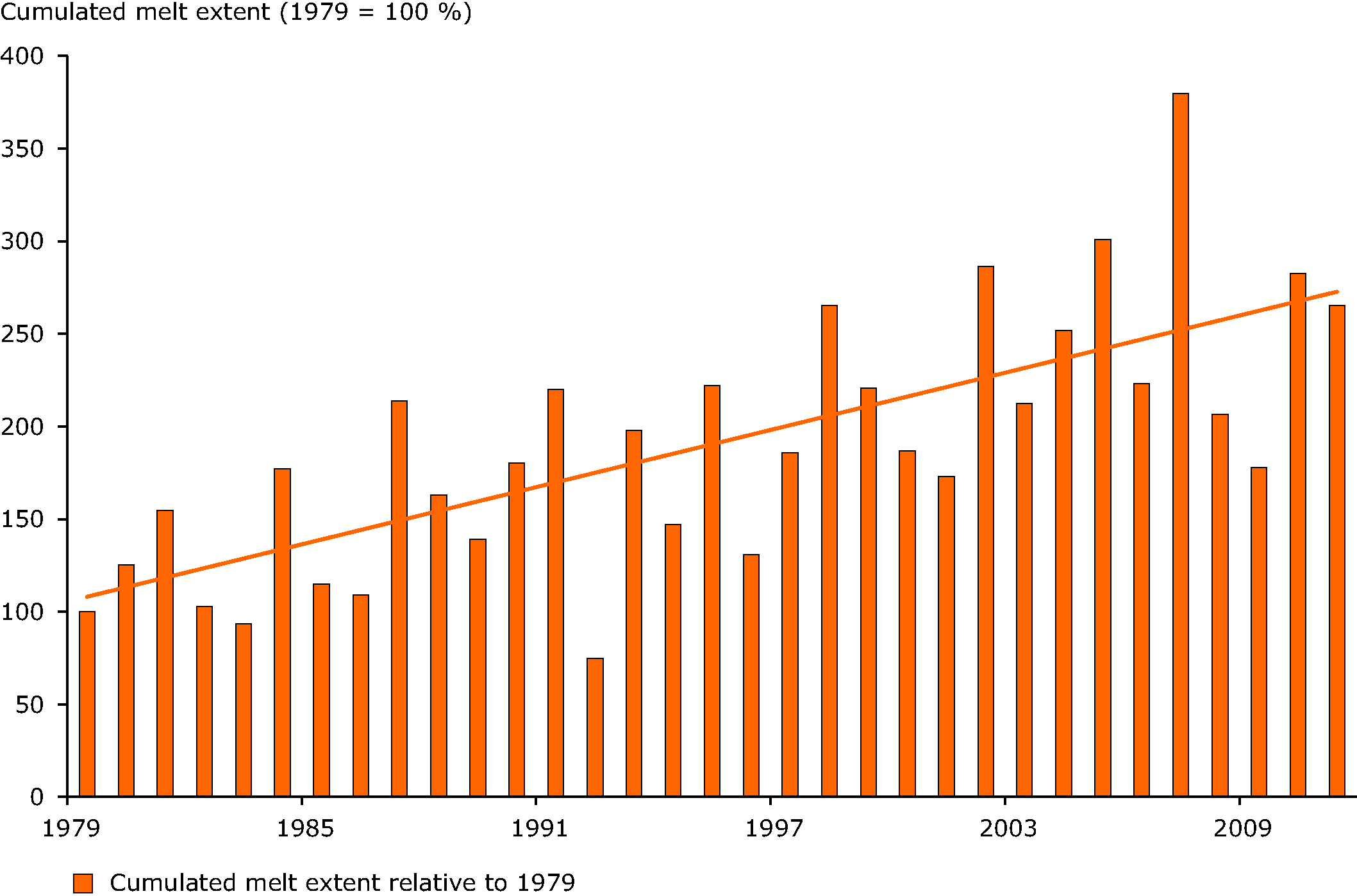See all EU institutions and bodiesThe figure shows the change in yearly cumulated area of the Greenland ice sheet and it's melt during the period 1979 to 2011 in percentage relative to area in 1979=100. The linear trend 1979–2011 is included.