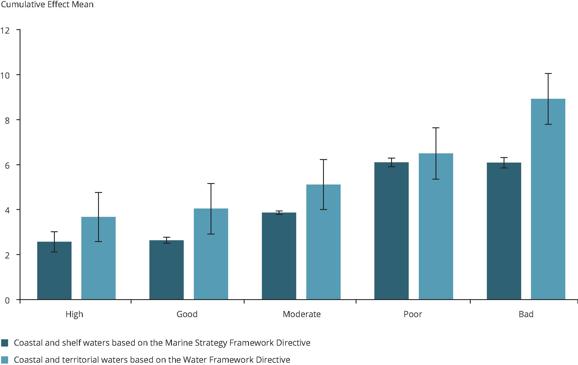 See all EU institutions and bodiesThe chart compares the results of the Cumulative Effect Assessment with the results of the Ecosystem Health Status (MESH+) Assessment and EU Water Framwork Directive ecological status (2016).