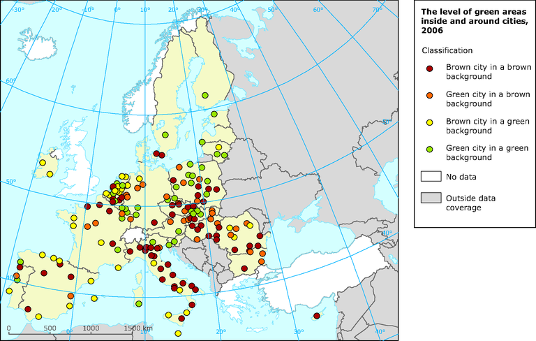 See all EU institutions and bodiesThe map shows the relation of green urban areas to the green background, i.e. it compares the mean value of green background of the city surroundings with the mean values of green urban areas of the core cities, both in [%]. Results are represented by points of different colours.