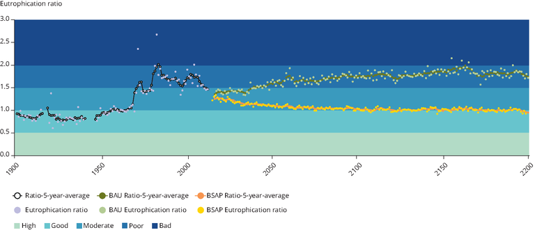 See all EU institutions and bodiesThe chart shows the average Eutrophication Ratio for the entire Baltic for each year from 1900 to 2200, as well as a 5-year moving average. The eutrophication ratio is calculated by the HEAT tool. A value above 1 indicates that there is a Eutrophic status. A value below 1 indicate a good (non-eutrophic status).