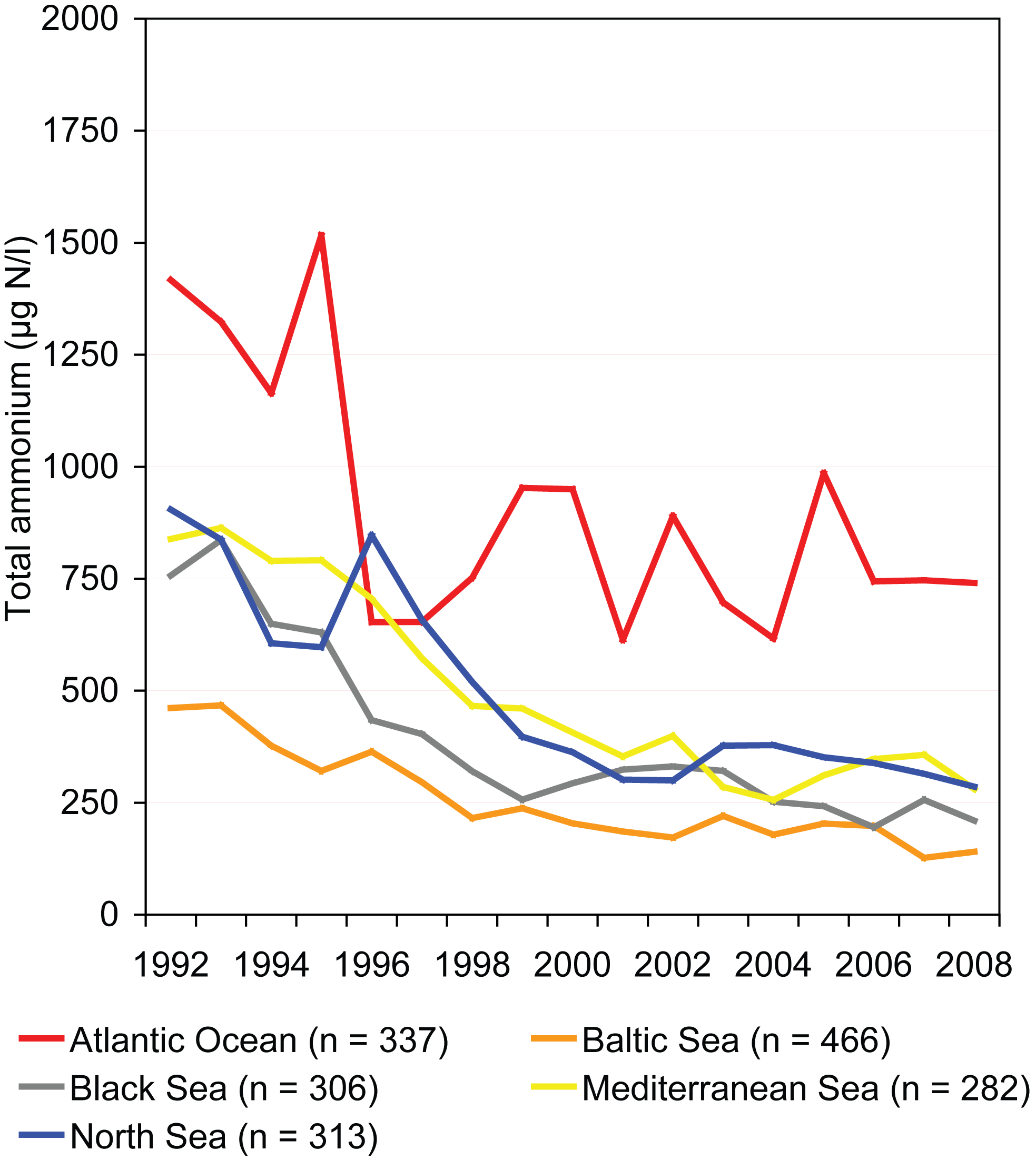 Concentrations are expressed as the average of annual mean concentrations. Up to 3-year gaps of missing values have been interpolated or extrapolated. Only complete series with no missing values after this interpolation/extrapolation are included. Number of river monitoring stations included in analysis per region and country within the corresponding region is noted in brackets. Two regions with few stations are not shown in the graph (Barents Sea: 1 station, Norwegian Sea: 2 stations). These stations have concentrations below 15 µg N/l since 2000 (5 and 3 µg N/l, respectively in 2008).
