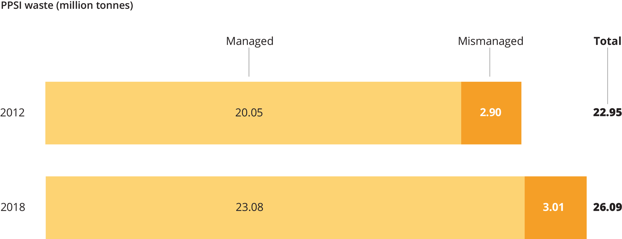 Total amounts of generated PPSI (plastic packaging and small non-packaging plastic items) waste (million tonnes) that is managed (light orange) and mismanaged (dark orange) in overall EEA-32 countries and United Kingdom, in 2012 and 2018