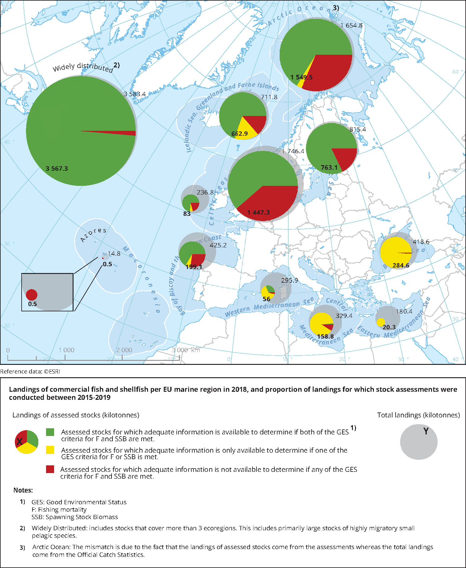 A distinction is made between the (1) landings for assessed stocks for which adequate information is available to determine whether both the GES criteria for F and SSB are met, (2) landings for assessed stocks for which adequate information is only available to determine whether the GES criteria for F or SSB is met, and (3) assessed stocks for which the available information on F and SSB is insufficient to determine if any of the relevant GES criteria are met. GES criteria refer to two (F and SSB) out of three criteria (the third cannot currently be calculate at the EU level) defining the ‘good environmental status’ (GES) of populations of commercial fish and shellfish species. GES is the objective of the EU Marine Strategy Framework Directive and needed to be achieved in 2020. These two criteria are met when F and SSB are compatible with having fish/shellfish population biomass levels above those capable of producing maximum sustainable yield (MSY). For further information, see the Methodology section, on how this distinction is made, and European Commission Decision 2017/848/EU on criteria and methodological standards on GES of marine waters.