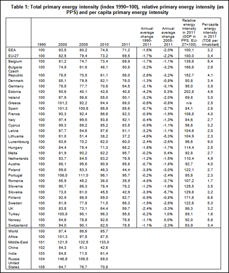The second last column shows the energy intensity measured in purchasing power standards relative to the EU-27. These are currency conversion rates that both convert to a common currency and equalize the purchasing power of different currencies. They eliminate the differences in price levels between countries, allowing meaningful volume comparisons of GDP. They are an optimal unit for benchmarking country performance in a particular year.