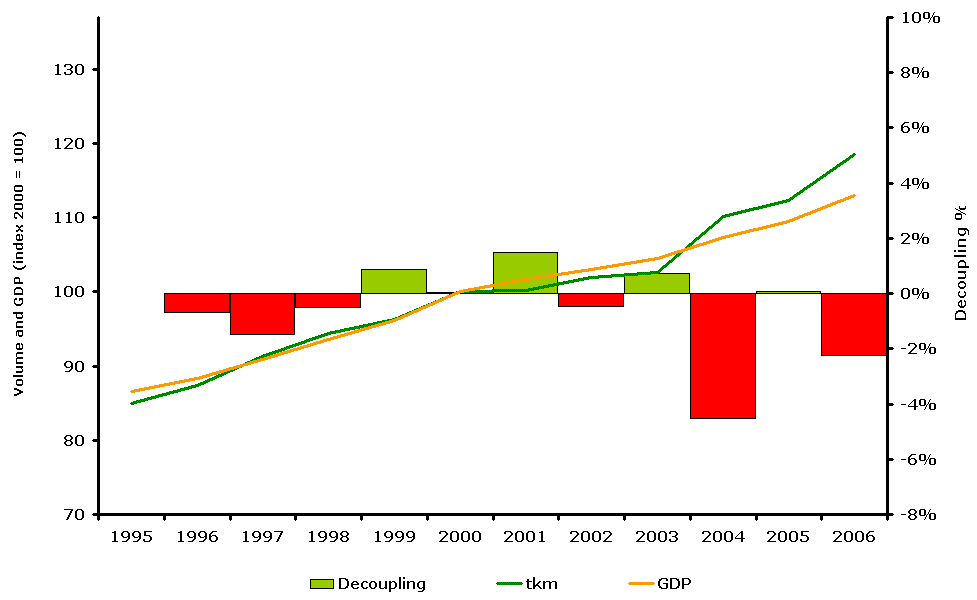 Green indicates faster growth in GDP than in transport while red indicates stronger growth in transport than in GDP. The large change in 2004 appears to be tied to a change in methodology but no correction figure exists. No data available for Bulgaria, Cyprus, Liechtenstein, Malta and Romania.