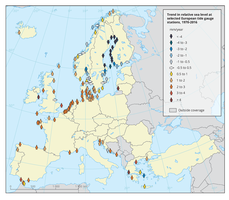 Trend in relative sea level at selected European tide gauge stations, 1970-2016