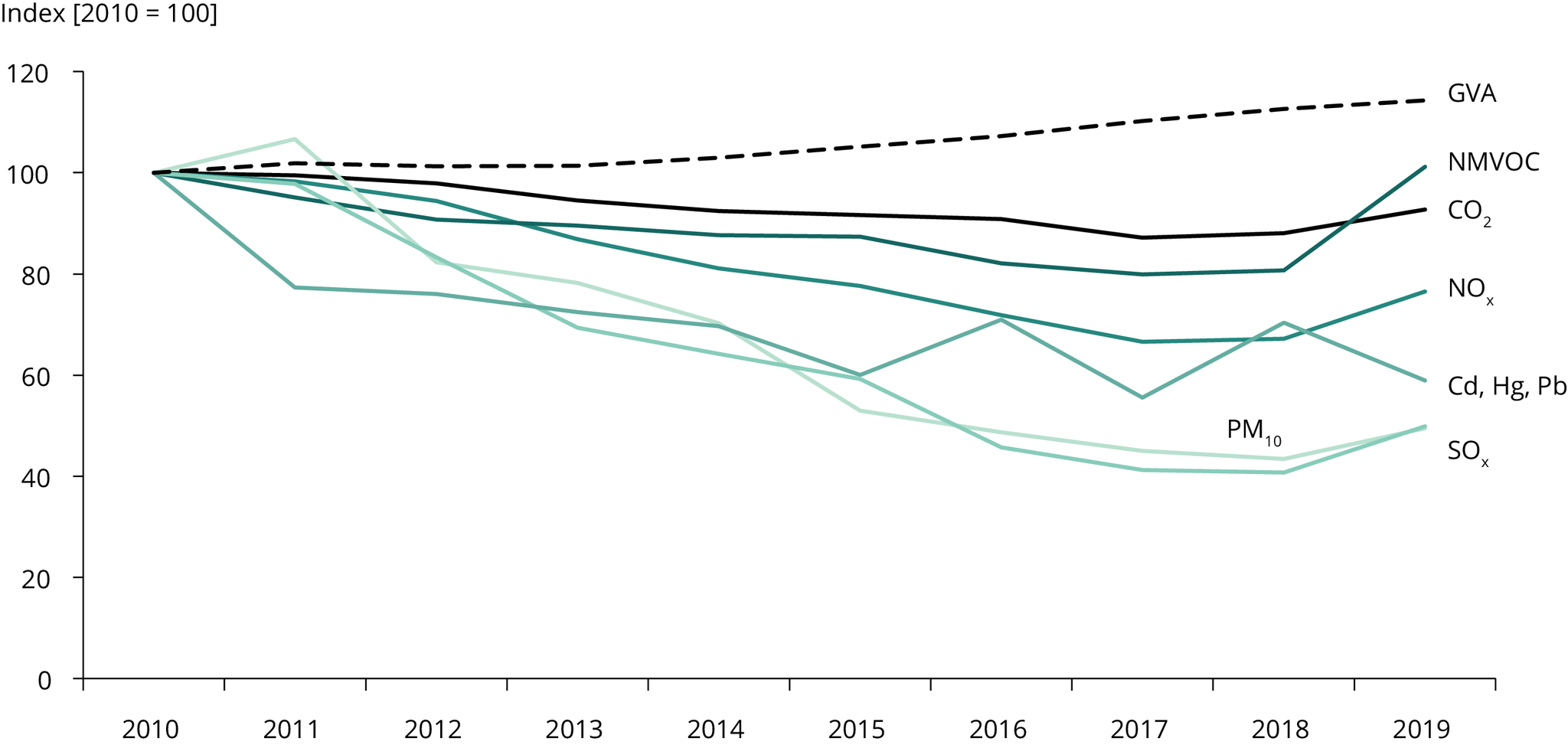 GVA, gross value added; NMVOC, non-methane volatile organic compound; NOx, nitrogen oxides; PM10, particulate matter with a diameter of less than 10 μm; SOx, sulphur oxides. GVA is used as a proxy for the economic activity of industry in Europe, accounting for inflation, based on 2010 values.