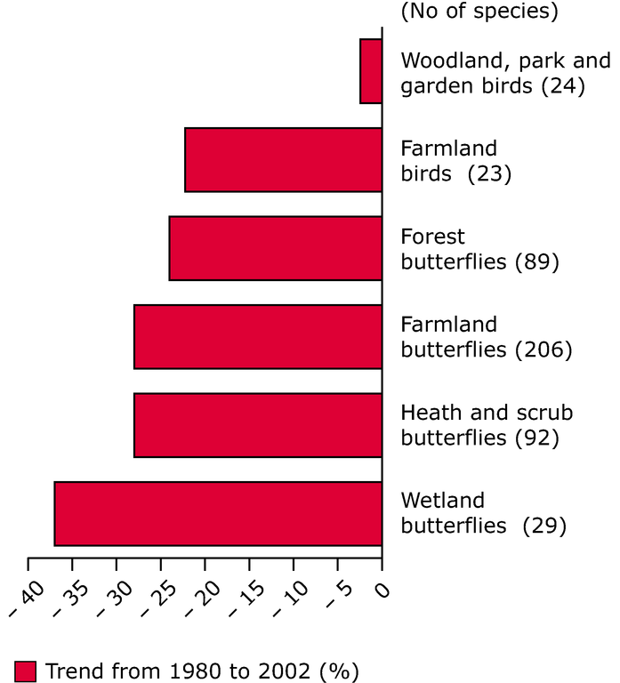 The bird trends reflect the period 1980-2002. The butterfly trends reflect the period 1972/73-1997/98. The names of the bird species taken into account are listed in the methodology for calculating the core set indicator on Species Diversity (CSI009).