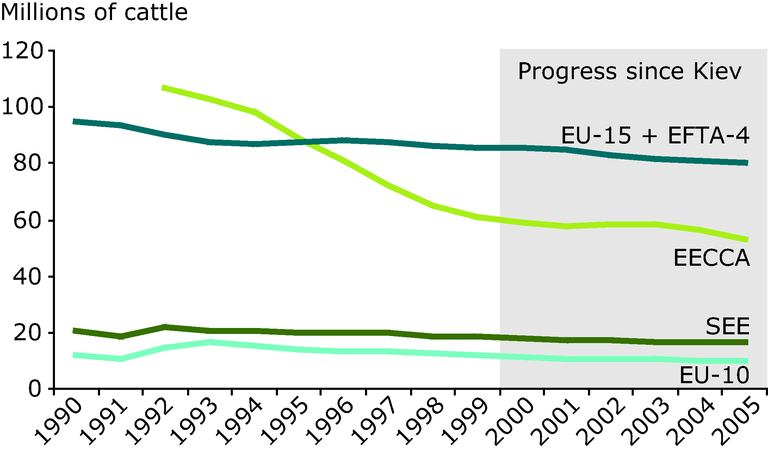 Similar declining trends are reported for pigs, sheep and goats in most SEE and EECCA countries, while in EU there was little change in pig, sheep or goat numbers.
