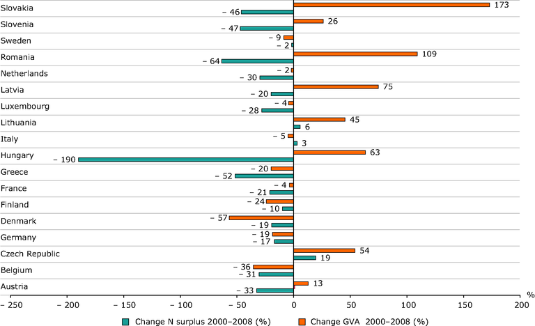 Trends in nitrogen surpluses on agricultural land and gross value added (GVA) of the agricultural sector in 18 EU Member States