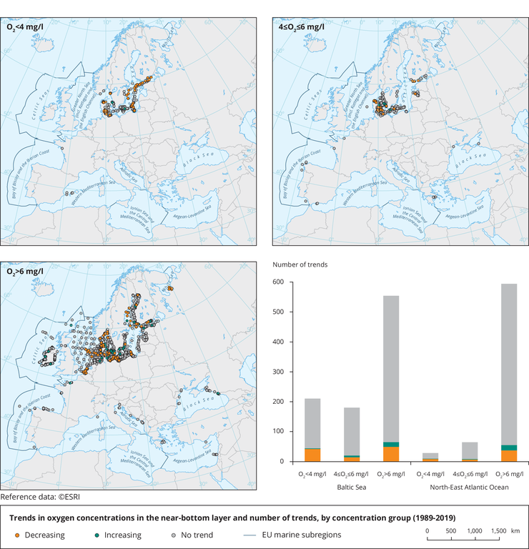 • The number of trends in the Mediterranean Sea and Black Sea are not shown as the number of time series is too low.