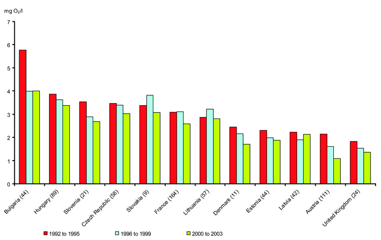 BOD5 data used for all countries except Estonia where BOD7 data used. Concentrations are expressed as median of annual average concentrations. Data are from representative river stations. Stations that have no designation of type are assumed to be representative and are included in the analysis. Consistent time series trends have been calculated using only stations that have recorded concentrations for each year included in the time series (see Methodology section for further details). Consistent time series then averaged for the 3 time periods 1992 to 1995, 1996 to 1999 and 2000 to 2003.