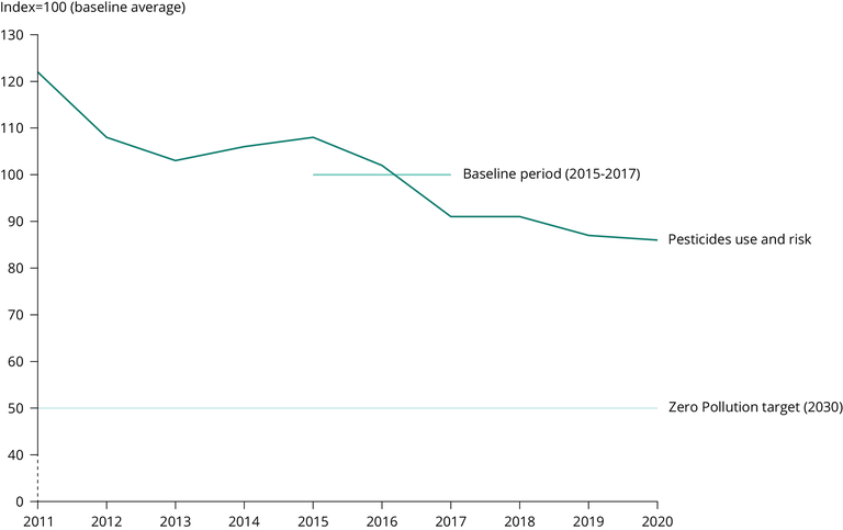 See all EU institutions and bodiesThe European Commission has developed a set of risk indicators on chemical pesticides to track progress towards the Zero Pollution and Farm to Fork target for pesticide reduction. These indicators show that the risk and use of pesticides has decreased by 14% since the baseline period in 2015-2017.