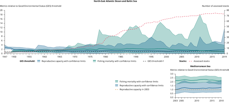 • Due to the reduced number of stock assessments available for the Eastern Mediterranean and the Black Sea, the indicators are not shown for these regions.