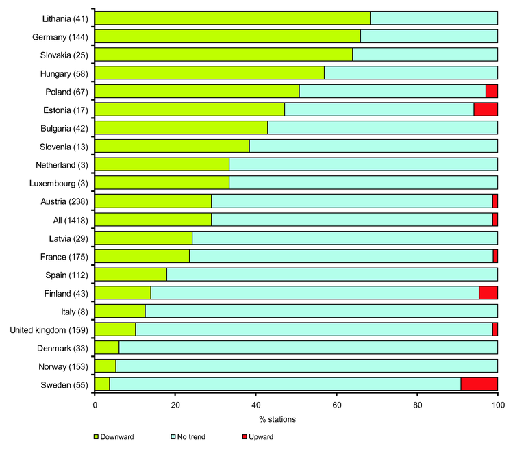 BOD5 data used for all countries except Estonia where BOD7 data used. Data are from representative river stations. Stations that have no designation of type are assumed to be representative and are included in the analysis. Time series trends have been calculated using only stations that have recorded concentrations for at least 4 of the years included in the time series. Sen''s Test then applied to determine statistically significant trends in the data (see Methodology section for further details).