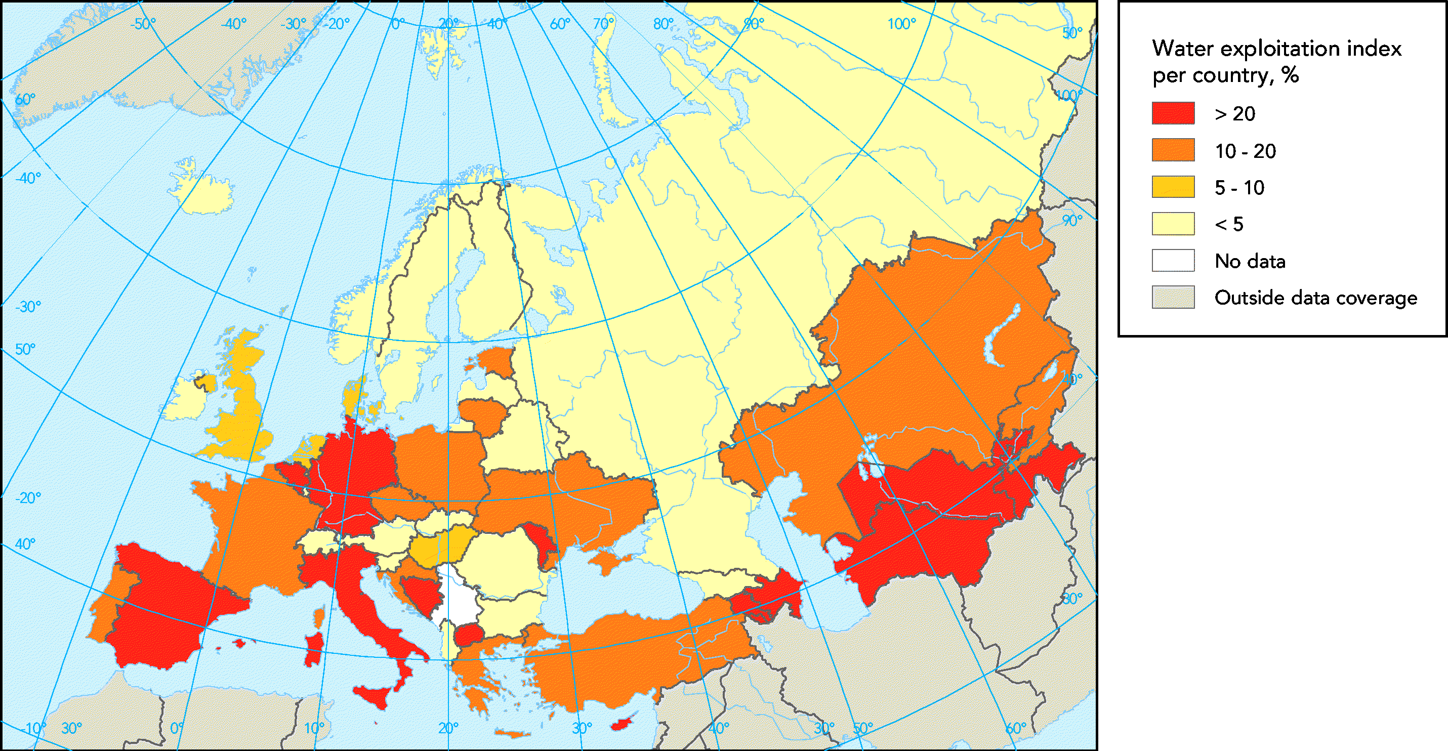 The water exploitation index (WEI), or withdrawal ratio, is defined as the mean annual total demand for fresh water divided by the long-term average freshwater resource. A WEI of more than 20 % is indicative of a water-stressed area particularly during drought or low river flow periods (Figure 8.1.). Using the 20 % criterion, about 31 % of the European population lives in countries suffering from high water stress, and 71 % in countries where water abstraction is more than 10 % of renewable freshwater resources. Even if a country has sufficient water resources at the national level there may be problems in dry regions or around large cities.