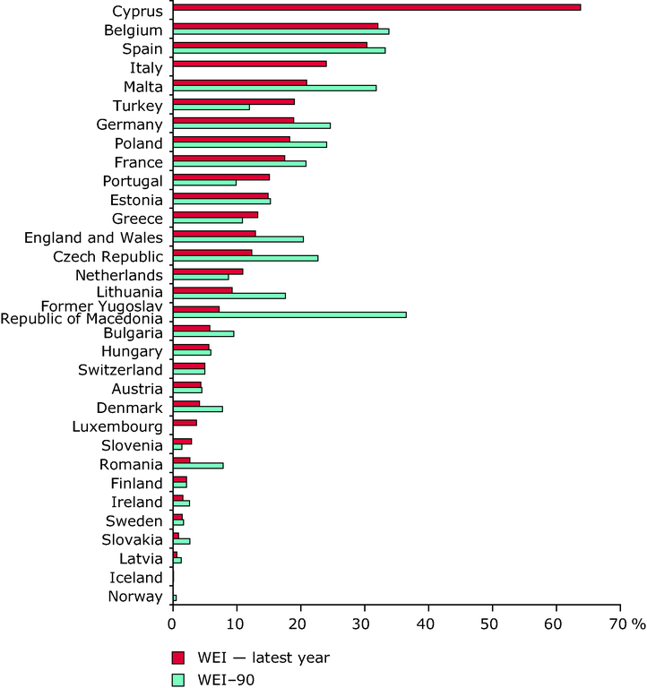 Water exploitation index (WEI) — in late 1980s/early 1990s (WEI‑90) compared to latest years available (1998 to 2007)