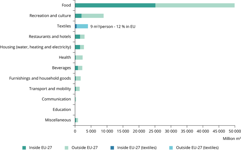 See all EU institutions and bodiesTo produce and handle all clothing, footwear and household textiles purchased by EU-27 households in 2020, an estimated 4024 million m³ of blue water was used (9m³ per person), making this consumption domain the third highest impact category after food and recreation. Only 12% of blue water consumption takes place within Europe.