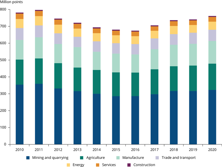 Own calculations based on Eurostat consumption trend data, Exiobase[1] and the European Commission’s Environmental Footprint method. The methodology used by the EEA to calculate the EU’s consumption footprint is widely used and is based on translating the monetary transactions of economic sectors into emissions to the environment. These emissions, in turn, are converted to a single unitless score (in points) representing all types of environmental and climate impacts. Pt, points.