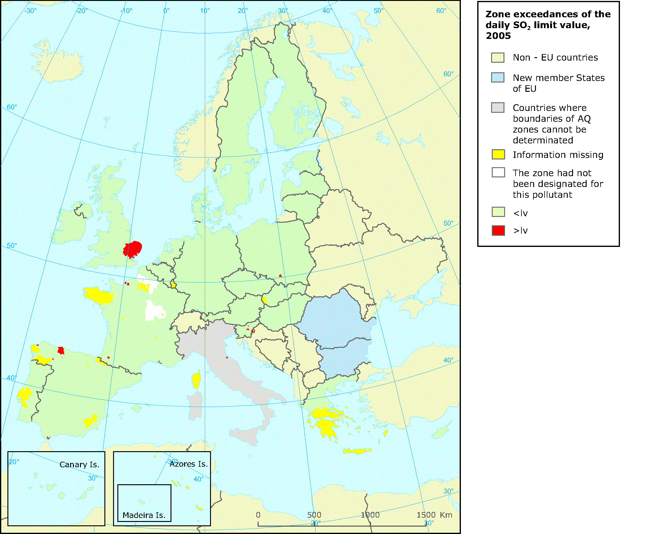 See all EU institutions and bodiesZone exceedances of the daily SO2 limit value, 2005, reported under Annual report (questionnaire) on air quality assessment and management (2004/461/EC).