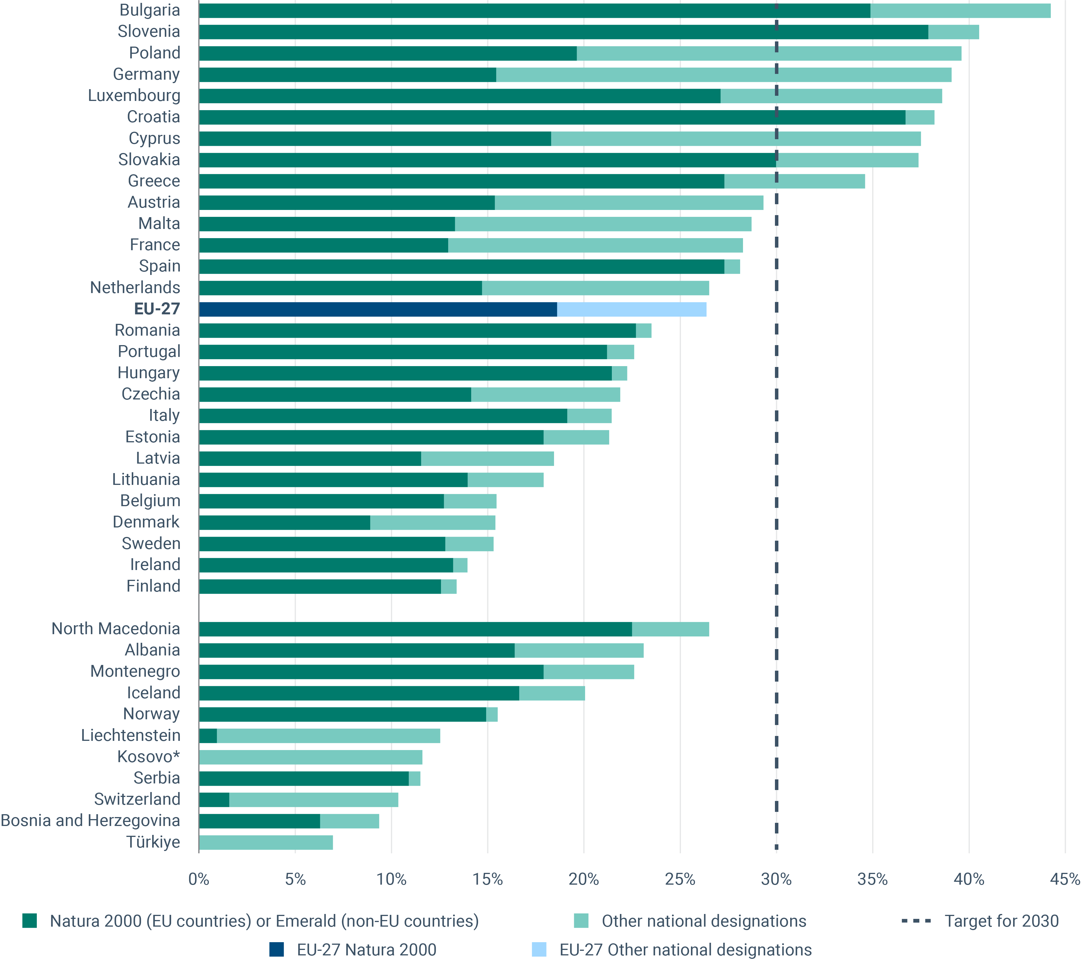 See all EU institutions and bodiesThis figure shows the percentage of EU-27 and country land area that is protected under Natura 2000 (for EU-27 countries) or Emerald network (for non-EU countries), and under other national designations.