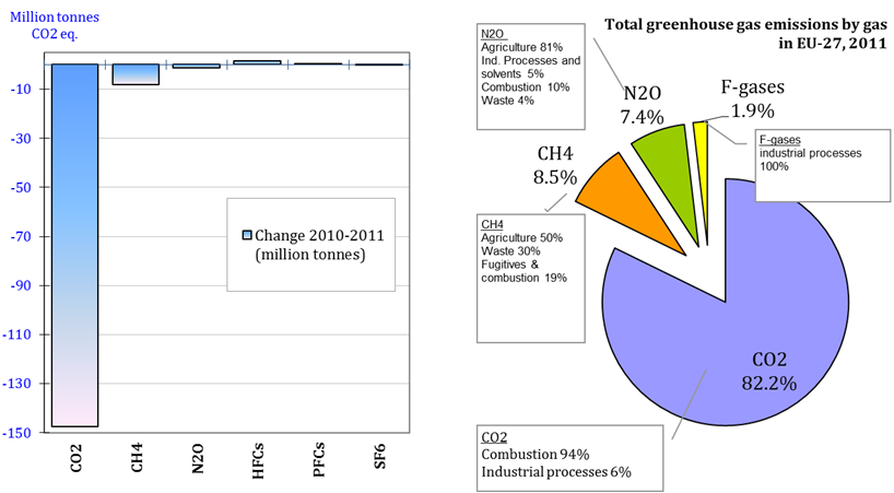 Absolute change of GHG emissions by gas in the EU 27, 2010 -2011 and total GHG emissions by gas in the EU 27, 2011