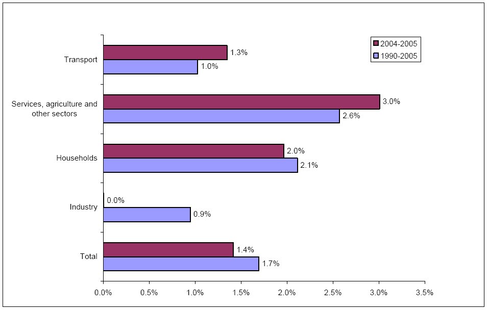 3. Average annual growth rate in electricity consumption by sector, 1990-2005 and 2004-2005 in EU-27