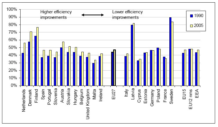 3. Efficiency (electricity and heat) production from conventional thermal plants, 1990 and 2005