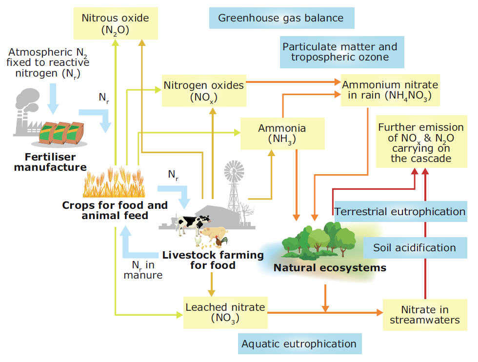 Note: This figure highlights the major anthropogenic sources of reactive nitrogen (Nr) from atmospheric nitrogen (N2), the main pollutant forms of Nr (yellow boxes) and related environmental concerns (blue boxes)