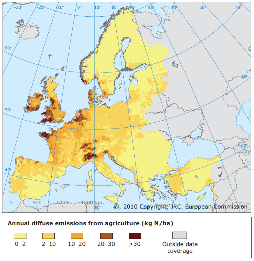 Following the peak production of reactive nitrogen in Europe during the 1980s, levels of nitrogen pollution have declined as a result of policies and regulations (for example the Nitrates Directive (91/676/EEC)) and have now stabilised, albeit at relatively high levels.