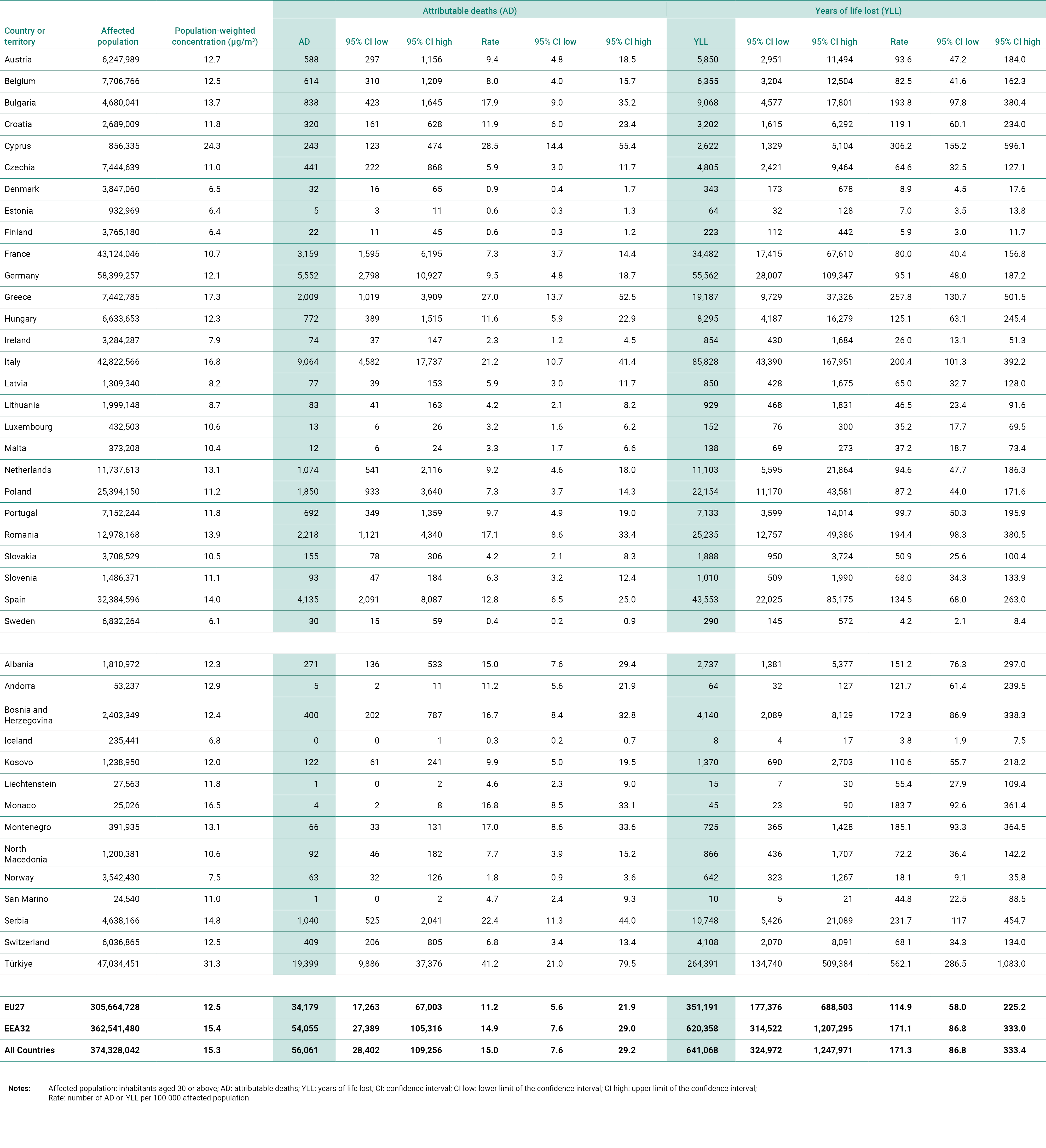 See all EU institutions and bodiesThe table shows, for every country and country grouping, population aged 30 years and above, NO2 population-weighted concentration, number of deaths, rate of deaths, number of years of life lost, and rate of years of life lost, attributable to NO2 concentrations above the WHO AQG level of 10µg/m3, together with the limits of their 95% confidence intervals.