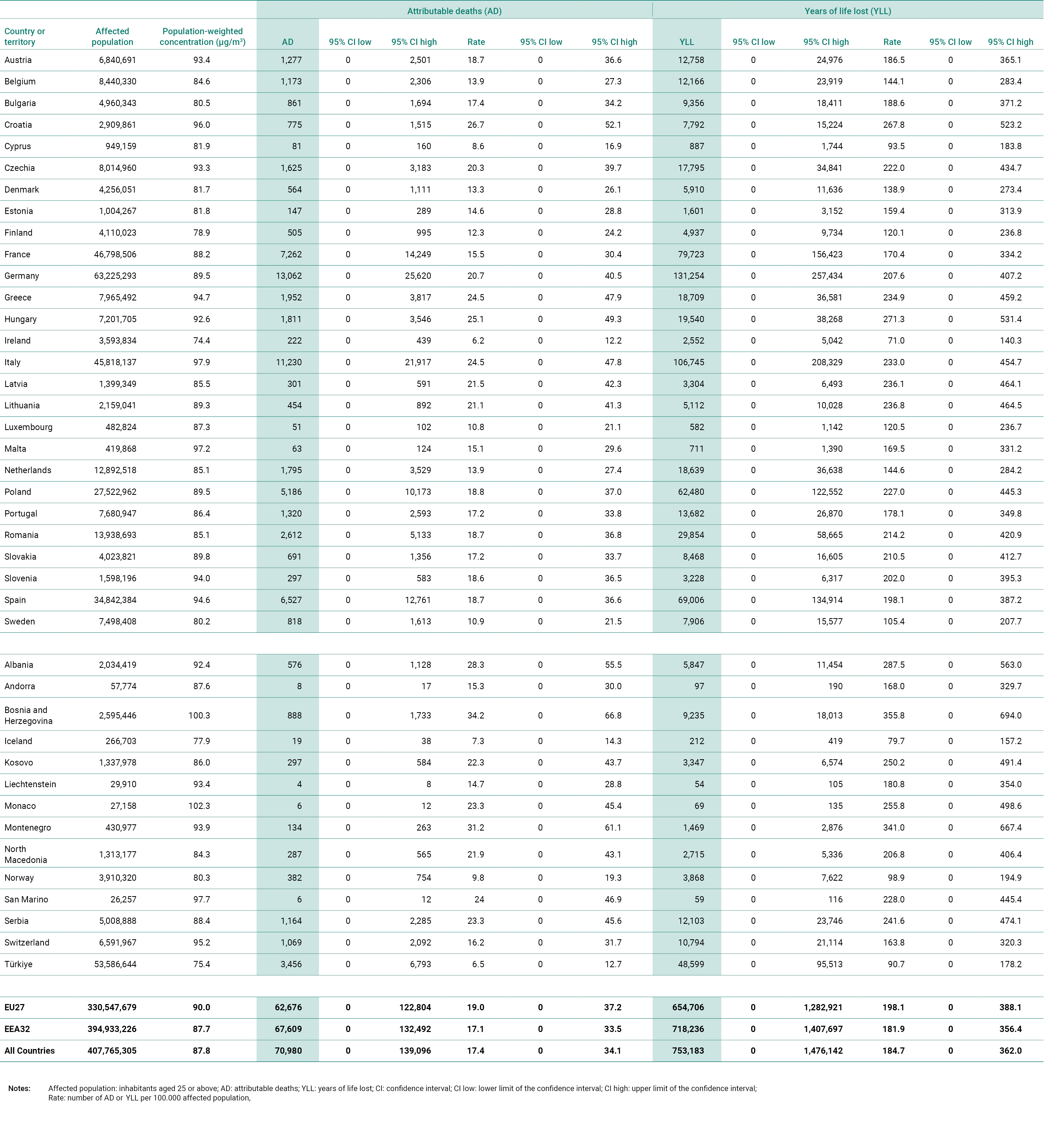 See all EU institutions and bodiesThe table shows, for every country and country grouping, population aged 25 years and above, O3 population-weighted concentration, number of deaths, rate of deaths, number of years of life lost, and rate of years of life lost, attributable to O3 concentrations above the WHO AQG level of 60µg/m3, together with the limits of their 95% confidence intervals.