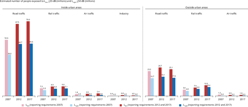 Figure 10. Estimated number of people exposed to unhealthy noise levels, based on END thresholds, in the EU in 2007, 2012 and 2017