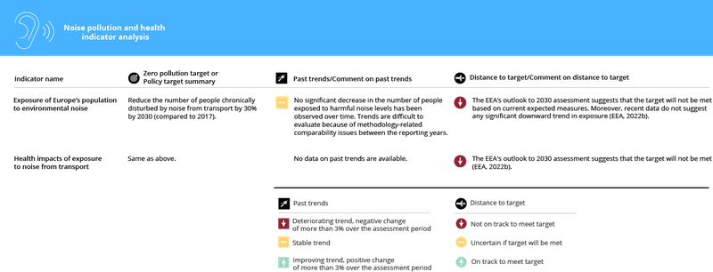 See all EU institutions and bodiesThis section of the zero pollution monitoring assessment presents available knowledge and trends on noise pollution and associated impacts on health, and assesses progress towards achieving relevant zero pollution targets and policy objectives.