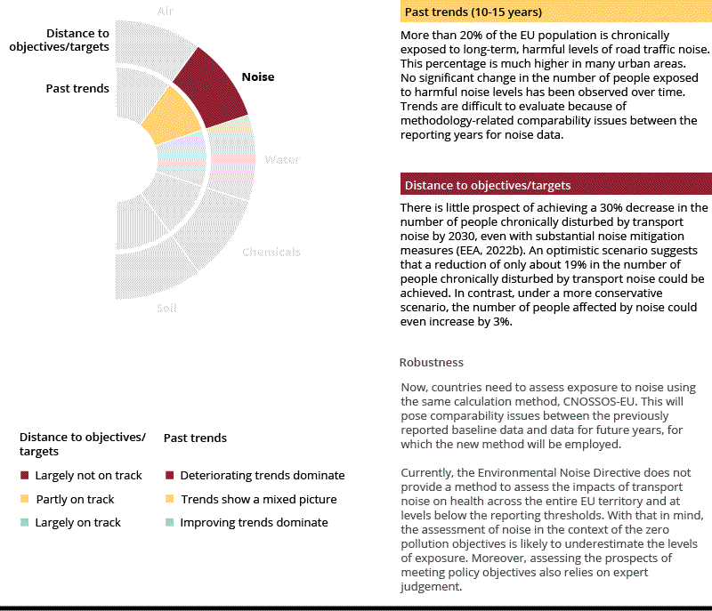 Based on baseline data from 2017, to achieve the zero pollution objective of reducing the number of people chronically disturbed by transport noise by 30% by 2030, the number of people highly sleep disturbed by noise in the EU must be reduced by 1.5 million, and the number of people highly annoyed must be reduced by 5.4 million (EEA, 2022a). Recent outlooks suggest that reaching these targets without further regulatory or legislative changes is unlikely, mainly because of the difficulty in reducing the large number of people exposed to noise from road traffic (EEA, 2022b).