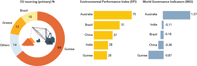 Figure 1. Countries supplying bauxite to the EU and proxies of the environmental (EPI) and governance (WGI) performance of the supplying countries