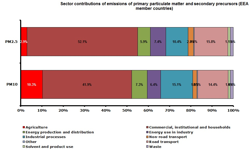The most important sources of primary PM10 emissions in 2010, across the EEA-32 region, were the sectors 'Commercial, institutional and households' (42% of total emissions), 'Industrial processes' (15%), 'Road transport' (14%) and 'Agriculture' (10%). The 'Commercial, institutional and households' sector includes combustion-related emissions from sources such as heating of residential and commercial properties.