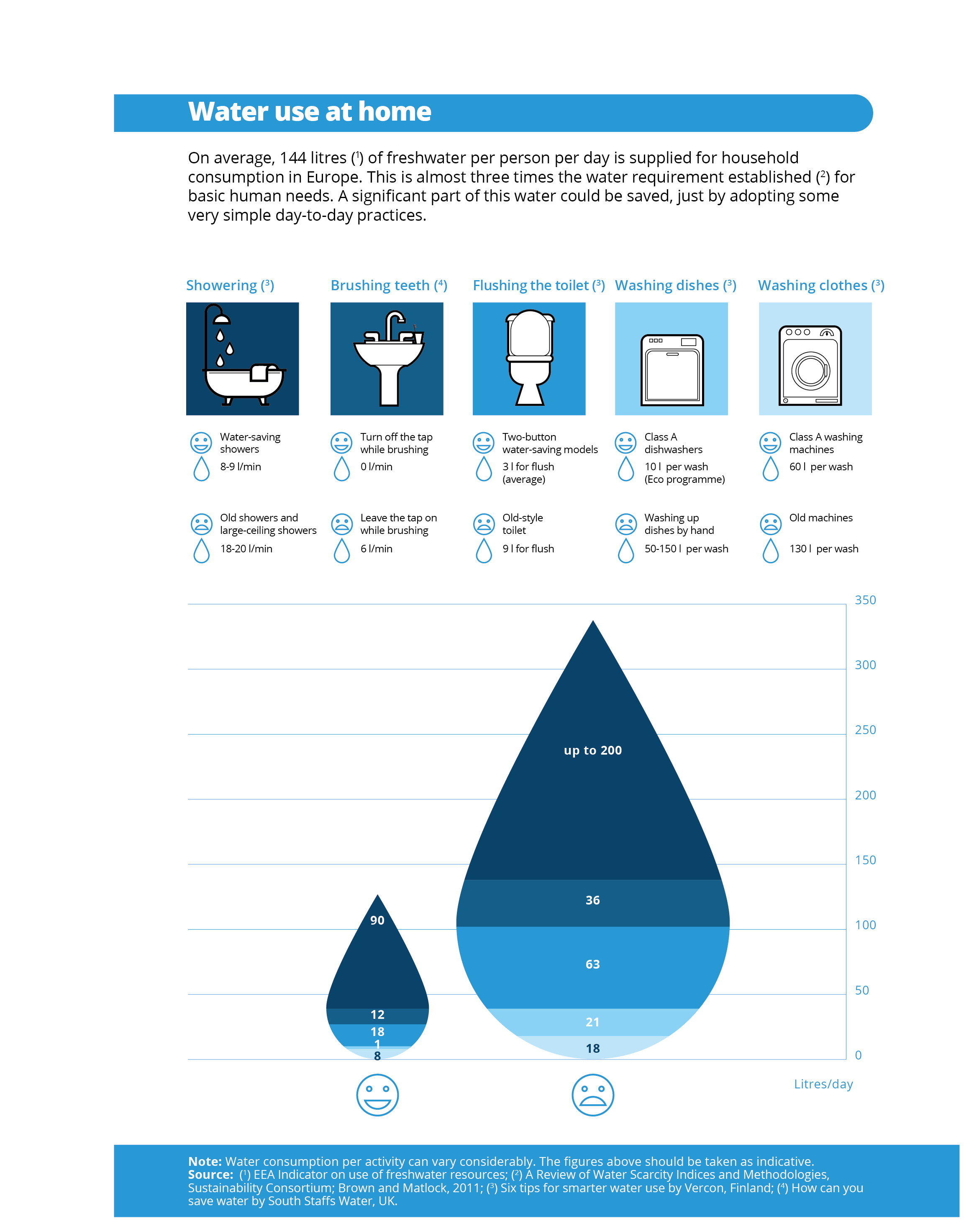 A combination of measures — pricing policies for saving water, reducing leakage, installing water-saving devices and more efficient household appliances — could help save up to 50 % of the water abstracted. Consumption could be reduced to 80 litres per person per day across Europe.
