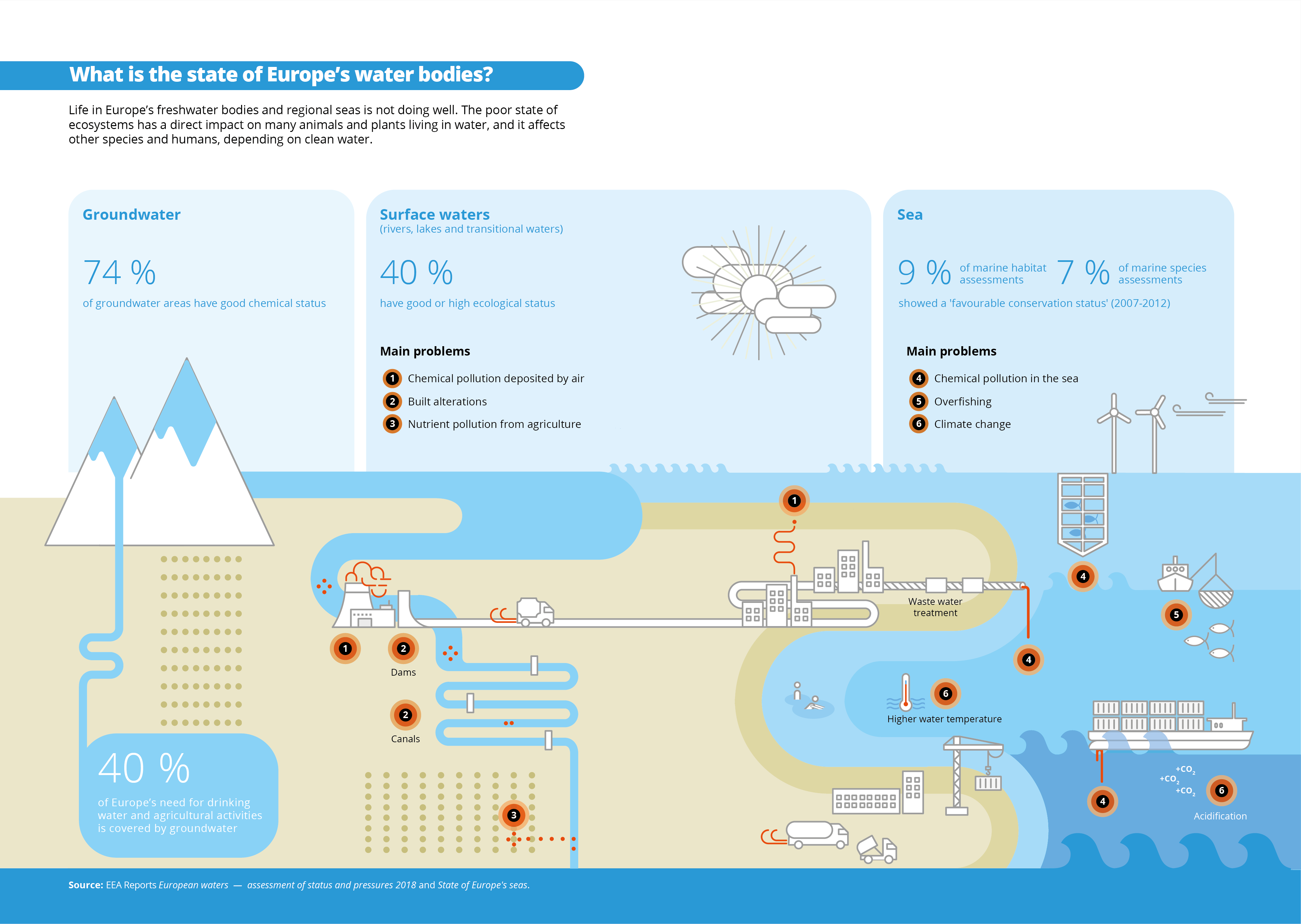 For centuries, humans have altered European water bodies to grow food, produce energy and protect against flooding. These activities have been central to Europe’s economic and social development, but they have also harmed water quality and the natural habitats of fish and other water life, especially in rivers. In many cases, water also has the unfortunate task of transporting the pollution we emit to air, land and water, and, in some cases, it is also the final destination of our waste and chemicals.