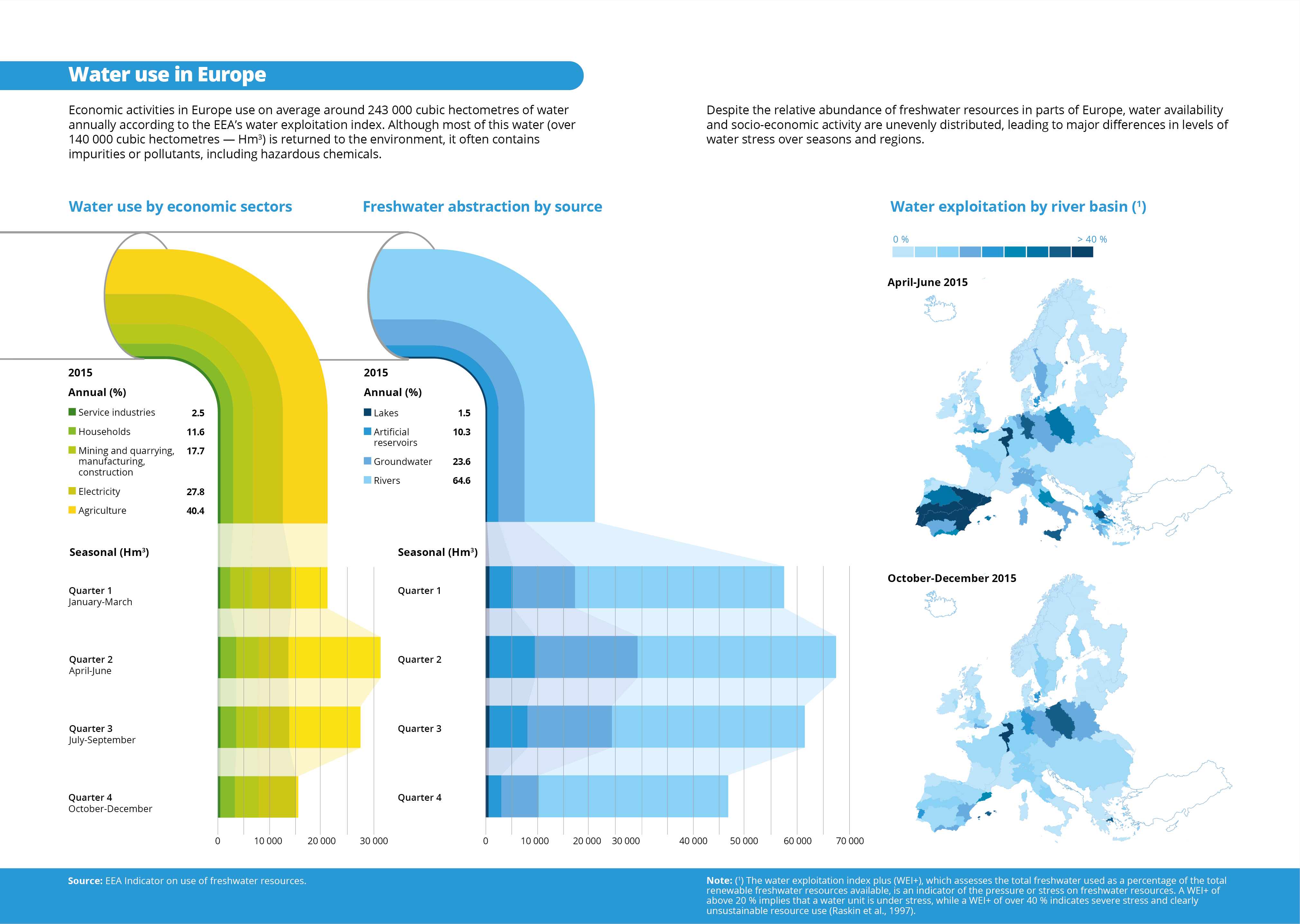 Economic activities in Europe use on average around 243 000 cubic hectometres ([2]) of water annually according to the EEA’s water exploitation index. Although most of this water (over 140 000 cubic hectometres) is returned to the environment, it often contains impurities or pollutants, including hazardous chemicals.