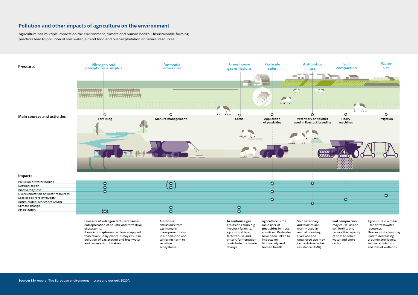 Agriculture has multiple impacts on the environment, climate and human health. Unsustainable farming practices lead to pollution of soil, water, air and food and over-exploitation of natural resources.